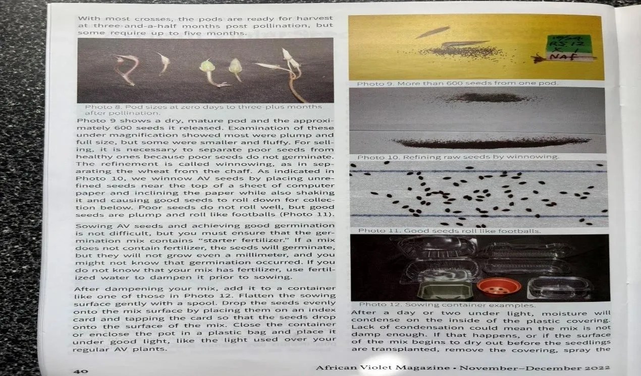 The purpose of this article is twofold. First, we want to explain the challenges involved in producing African violet (Av) seeds on a large scale. Second, we will describe the methods we developed to overcome those challenges. If seed production were easy, we would not be the only people in the world who make and sell Av seeds, both to the public and to major seed companies.